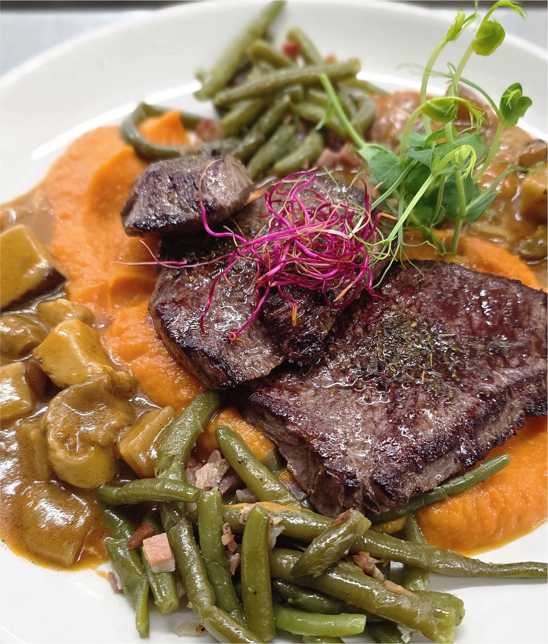 mit Speckbohnen, Kürbis-Püree und Waldpilz Sauce