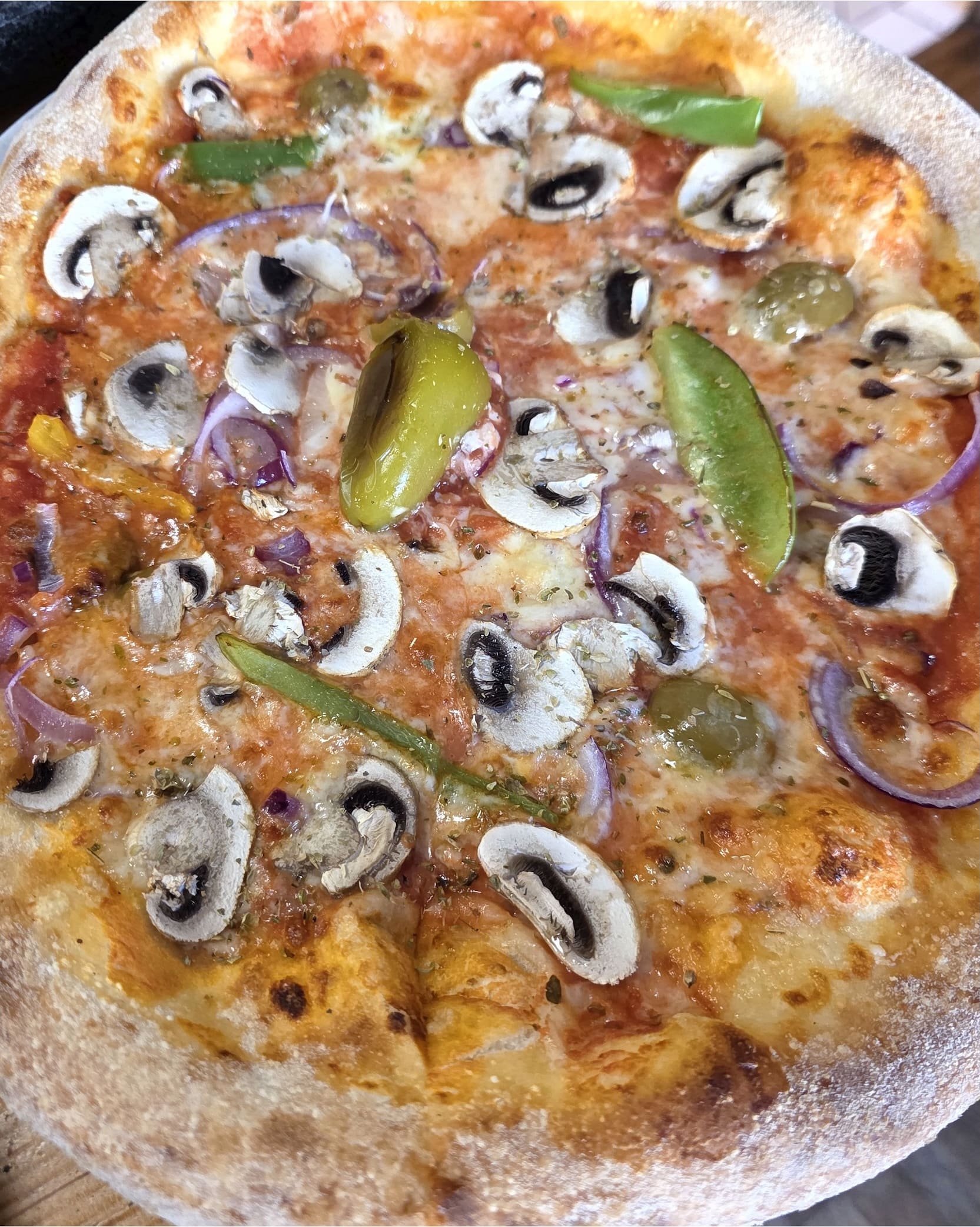 mit Tomaten, Käse, Paprika, Pfefferoni, Oliven, Zwiebeln, Champignons und Oregano