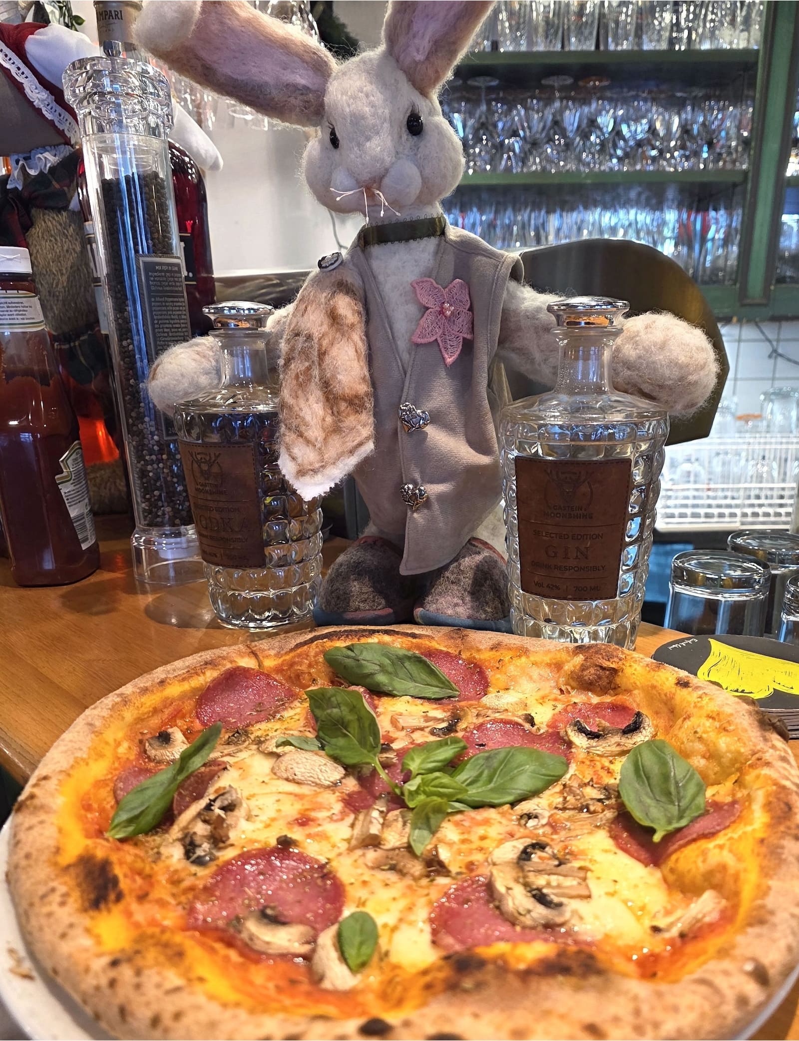 mit Tomaten Käse, Speck, weiße Zwiebel, Pilze, Oliven, Gorgonzola und Oregano